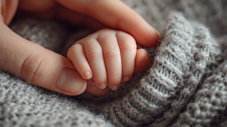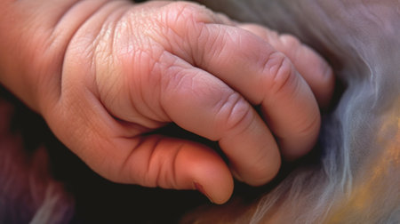 Parental bond: gentle adult hand delicately touching a newborn baby's tiny fingers, symbolizing love, care, and protection
