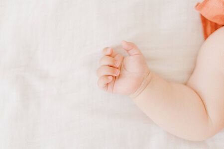 Crop close up of cute tiny fist hand of little newborn kid sleeping on white sheets in cozy bedroom. Small baby infant child nap relax in comfortable bedroom at home. Motherhood, ivf concept.