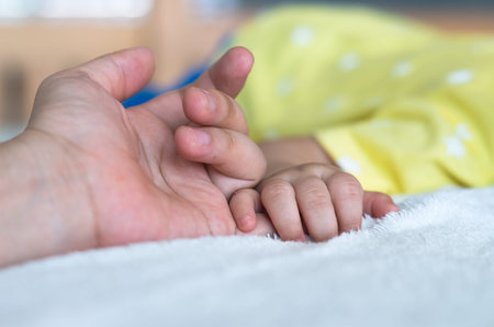 Father's hand holding his baby's hand on the bed at home