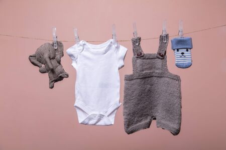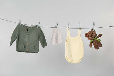 Baby clothes, shoes, pacifier and toy hanging on rope against color background