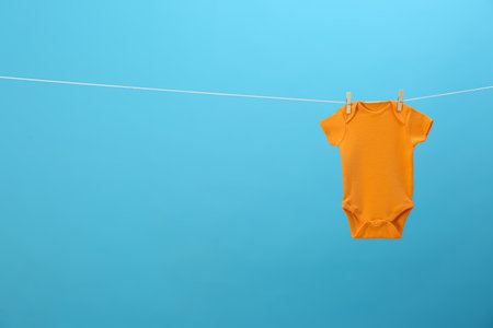 Baby bodysuit hanging on clothes line against blue background, space for text. laundry day