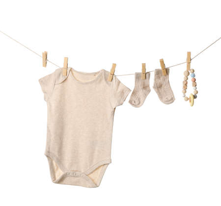 Baby clothes and teddy bear on a clothesline on white background - Image