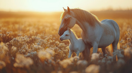 A beautiful mare stands protectively beside her playful foal in a sunlit meadow filled with wildflowers at sunset, casting a warm golden glow on the scene.