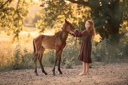 Foal with mother in the meadow at sunset. Selective focus.