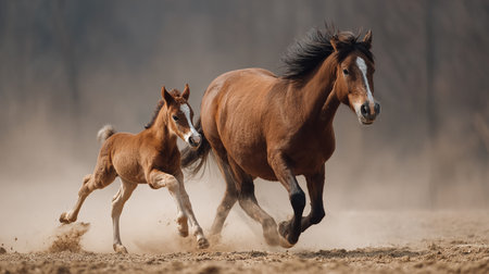 A captivating scene featuring a majestic horse alongside its adorable foal in a misty morning landscape. The soft light illuminates the serene surroundings, showcasing the bond between them.