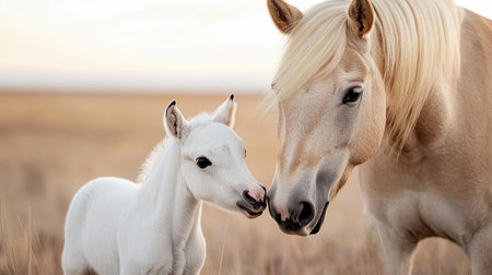 A charming young foal stands confidently next to an adult horse, showcasing their bond in a tranquil natural setting surrounded by soft grasses and warm light.
