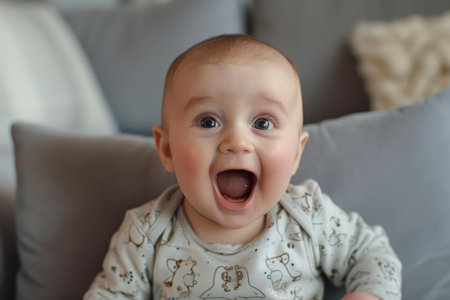 Adorable Infant Laughing Joyfully on Couch, Exuding Happiness and Innocence with Open-Mouth Smile