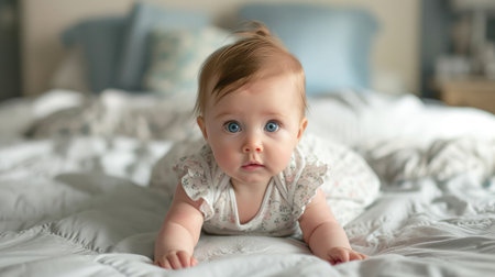 Cute baby girl with blue eyes lying on bed and looking at camera