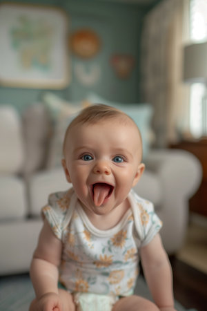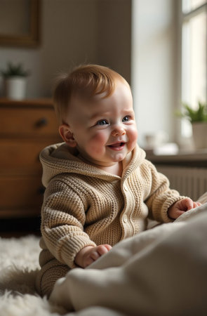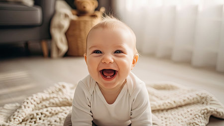 A close-up captures a cheerful baby with a wide smile, displaying joy. The scene takes place indoors, bathed in natural light. The composition highlights the baby's expression. This image might be suitable for various commercial or editorial applications related to childhood, happiness, and family.
