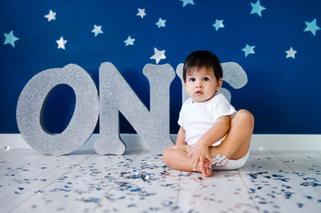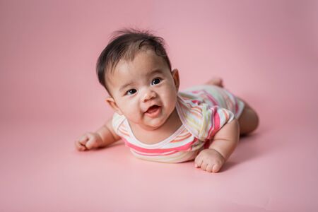 Adorable baby filled with joy and happiness gazes up at the camera in a charming studio setting.