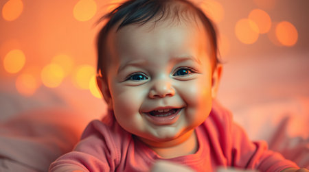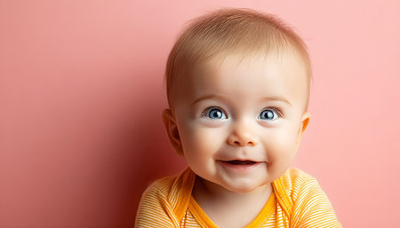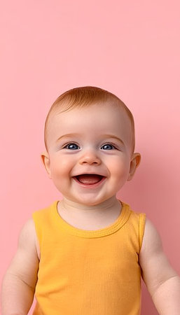 Adorable baby with a joyful expression, capturing pure happiness against a soft pink backdrop.