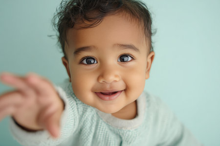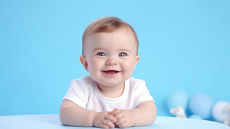 Adorable Baby Smiling Joyfully in a Teal Background, Capturing Innocence and Pure Happiness Moments