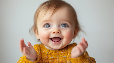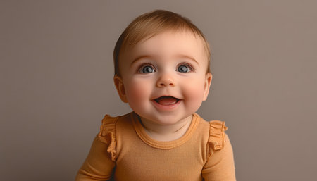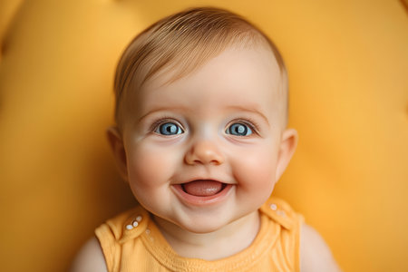 Adorable Infant Joyfully Grinning at Camera in Heartwarming Studio Portrait with Vibrant Background