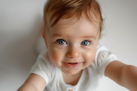 Inquisitive Baby with Bright Eyes and Charming Smile Captured in Studio on Plain Background