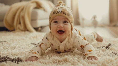 A baby wearing a cute animal-themed onesie, crawling on a fluffy carpet, with a big smile on their face.