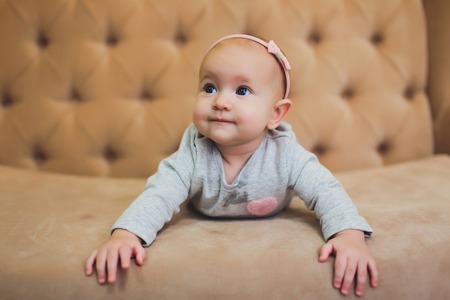Sweet adorable baby girl lying on a couch looking towards camera. 6-7 months old infant on belly lifting upper body.