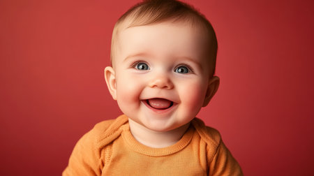Joyful baby portrait on solid red backdrop, showcasing happiness and innocence in a sweet smile.