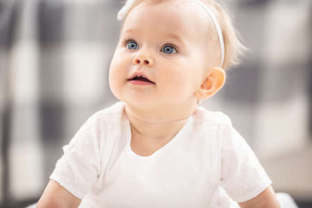 Portrait of a cute smiling baby girl with blue eyes. Shallow depth of field.