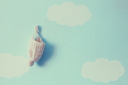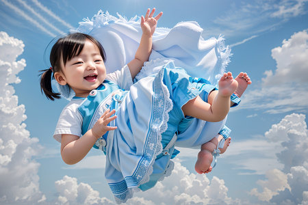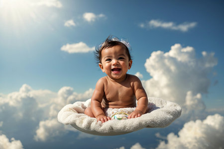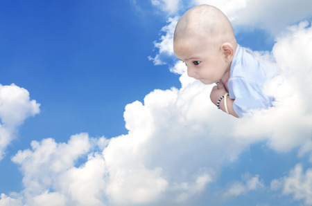 infant newborn baby looking down from the clouds on blue sky