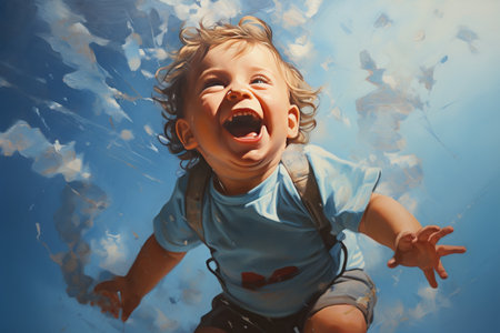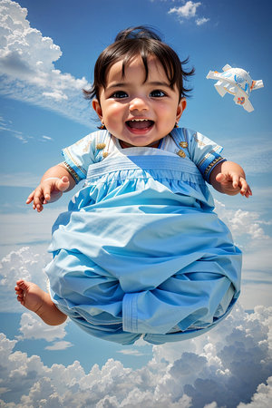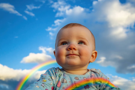 Happy baby smiling against a bright blue sky with fluffy clouds and a rainbow, showcasing innocence and joy in a colorful setting