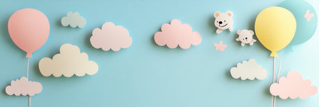 Soft pastel clouds and floating balloons create a whimsical, playful atmosphere perfect for enhancing invitations or decor.