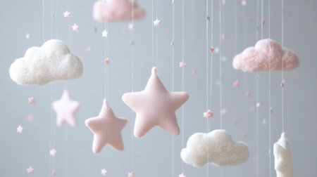 A charming arrangement of soft pink stars and clouds gracefully hangs from invisible strings, enhancing a tranquil nursery atmosphere with gentle decor.