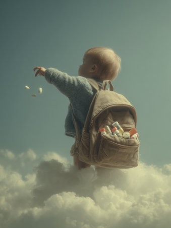 A baby is curiously reaching into a backpack overflowing with various medicines while surrounded by a soft, faded sky, evoking a sense of wonder.