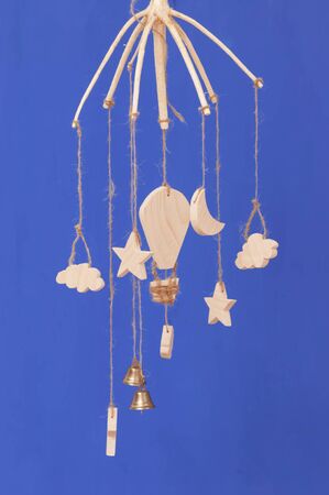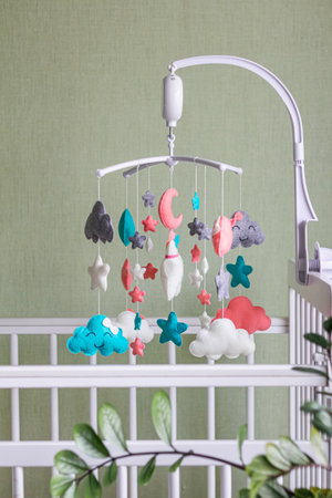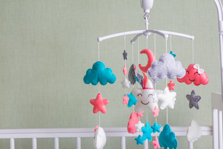 Baby crib mobile. Toys above the baby crib. Hanging soft clouds, stars and moon for the child.
