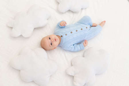 baby on the bed among the cloud pillows. Textiles and bedding for children.
