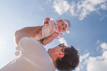 Happy young father playing with adorable baby girl outside, family lifestyle, dad holding kid high in the air