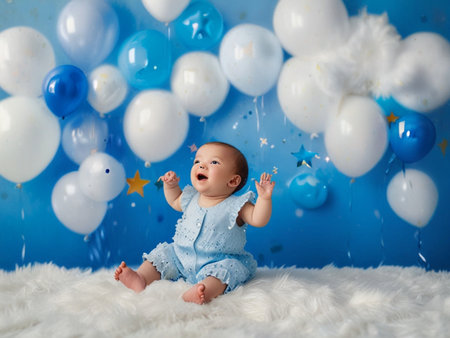 Cute newborn baby girl in blue dress sitting on white fur with balloons