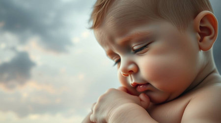 A serene image of a sleeping baby nestled in soft white cotton, evoking feelings of peace, tranquility, and innocence, ideal for conveying warmth and love during tender moments.