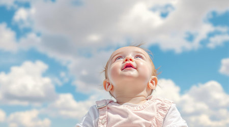 Adorable baby gazing upward under fluffy clouds on a sunny day.