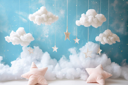 Paper background for birthday baby photoshoot. Blue sky and handmade paper cutting stars.