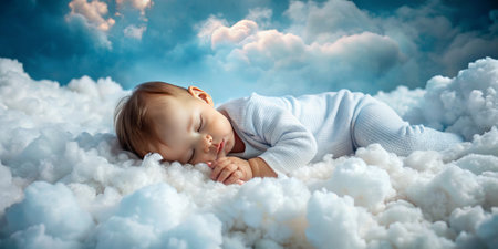 Cute baby boy sleeping on white fluffy clouds under blue sky. AI generated