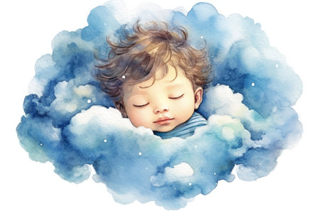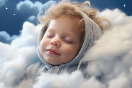 illustration of a small child sleeping on a cloud. AI generated.
