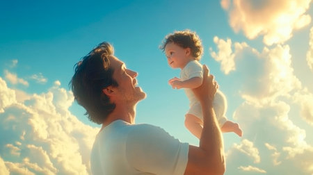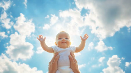 A joyful baby is joyfully held high up against a beautiful backdrop of fluffy clouds and a vivid blue sky