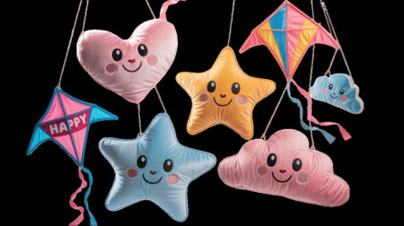 Hanging plush toys with kites on transparent background