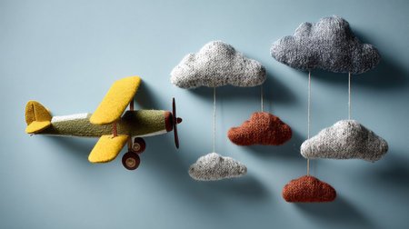 Charming felt toy airplane soaring through colorful clouds creates a playful atmosphere, perfect for decorating a child's room or nursery.