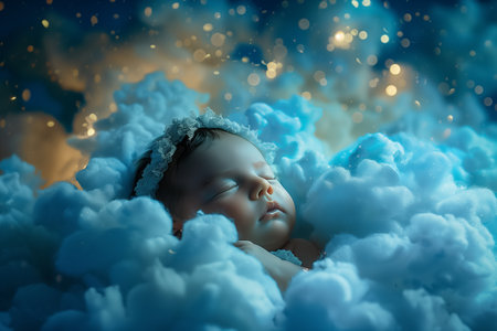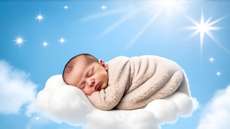 Cute newborn baby sleeping on a cloud with stars in the background