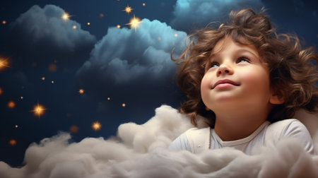 A charming child gazes upward, nestled in dreamy clouds, bathed in soft, warm light creating a magical, whimsical scene.