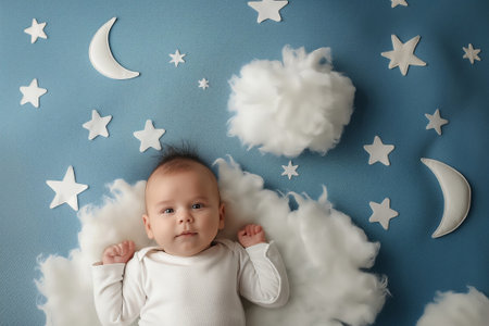 Adorable baby lies on a blue background with a decorative moon, stars, and clouds