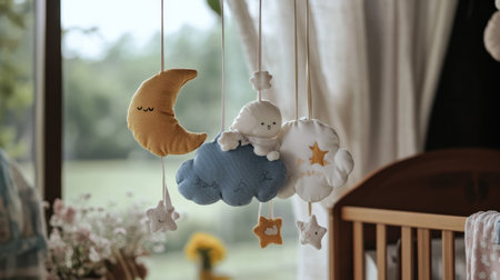 Stars and clouds hang gracefully from invisible strings, adding a whimsical touch to a nursery, creating a serene and dreamy environment for children.