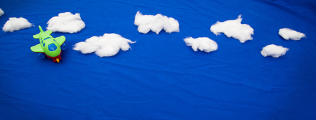 Flat lay design of travel concept with clouds on blue background with copy space.