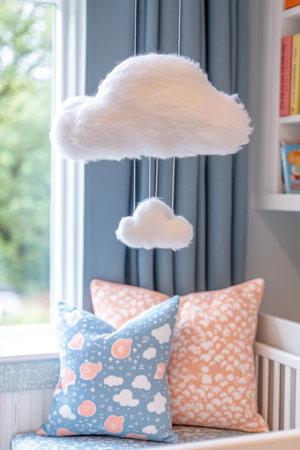 Cozy Nursery Corner Fluffy Cloud Mobile, Colorful Cushions, and Window with Soft Gray Curtains.