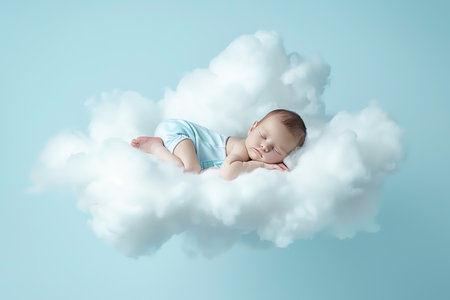 Baby sleeping peacefully with soft clouds and plush toys on pastel blue background