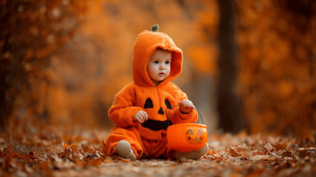 A delightful scene of a cute toddler dressed in a pumpkin costume, sitting on colorful autumn leaves, holding a pumpkin-shaped bucket amidst a beautiful fall landscape.