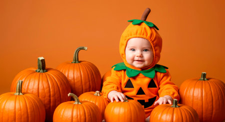 Baby in a pumpkin costume sits happily among a collection of pumpkins on a vibrant orange background for Halloween.