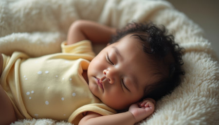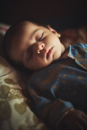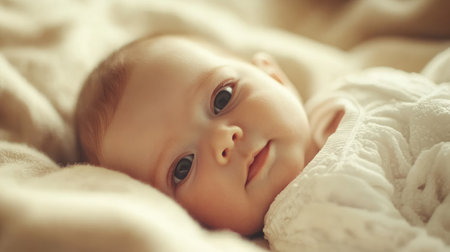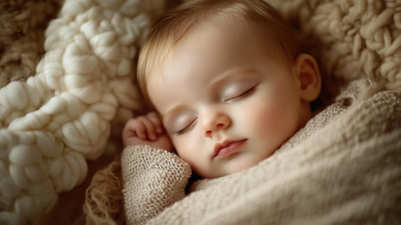 A serene baby sleeping soundly, wrapped in a cozy blanket, bathed in soft, warm light, creating a peaceful atmosphere.