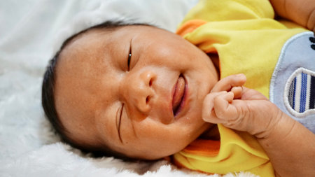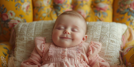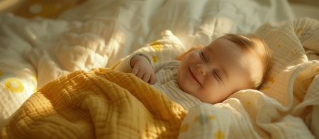 A smiling baby enjoys a peaceful nap in a cozy, sunlit bed, embodying innocence and serene moments of childhood.